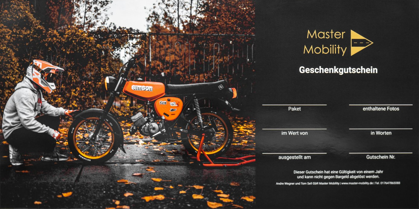 Auto- und Motorradshootings verschenkst Du pure Freude! Die physischen Gutscheinkarten sind hochwertig gedruckt und